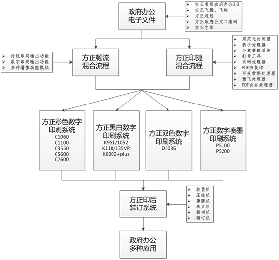 方正政府文印解決方案,從政府辦公文件電子文件的制作入手,優化政府文印的生產的流程,采用一套流系統整合政府文印現有的生產環境,提升生產效率和提升操作的方便性。