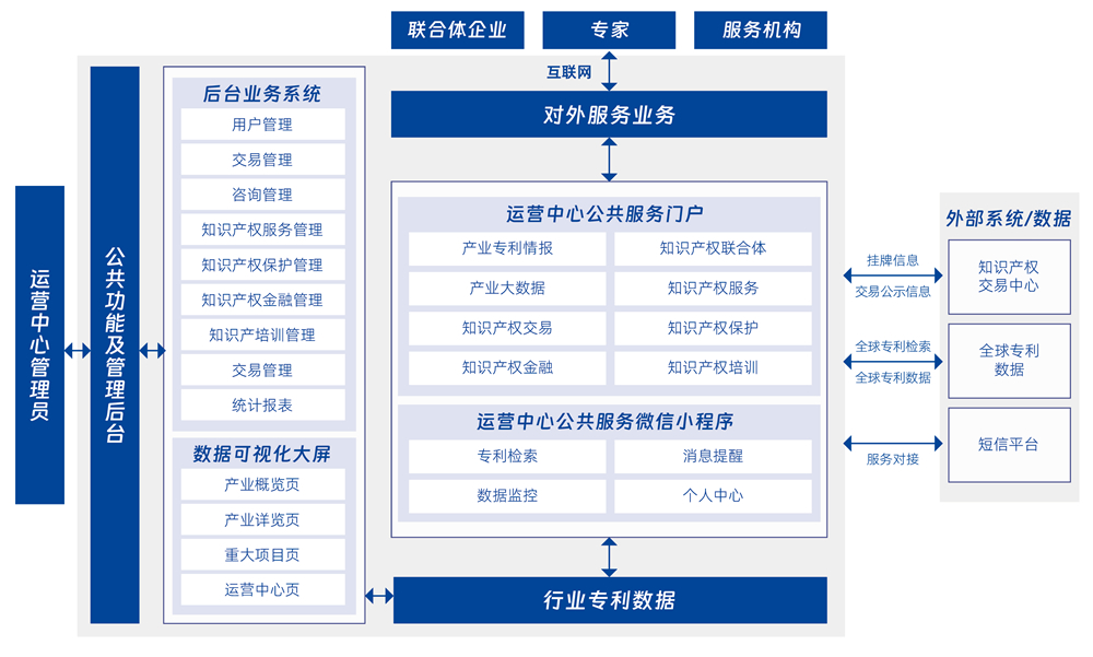 產(chǎn)業(yè)知識(shí)產(chǎn)權(quán)運(yùn)營(yíng)支撐平臺(tái)以數(shù)字化創(chuàng)新技術(shù)輔助提升產(chǎn)業(yè)知識(shí)產(chǎn)權(quán)創(chuàng)造、運(yùn)用、保護(hù)、管理和服務(wù)水平,平臺(tái)采用“一庫四中心”模式,即產(chǎn)業(yè)專利專題庫和數(shù)字支持中心、創(chuàng)新服務(wù)中心、運(yùn)營(yíng)交易中心、交流合作中心,采用數(shù)字化驅(qū)動(dòng)產(chǎn)業(yè)知識(shí)產(chǎn)權(quán)運(yùn)營(yíng),推動(dòng)產(chǎn)業(yè)知識(shí)產(chǎn)權(quán)多元化保護(hù),支撐推動(dòng)開發(fā)許可落地實(shí)施,多渠道推動(dòng)產(chǎn)業(yè)運(yùn)營(yíng)高質(zhì)量發(fā)展,持續(xù)構(gòu)建多放共贏的產(chǎn)業(yè)運(yùn)營(yíng)生態(tài)圈。
