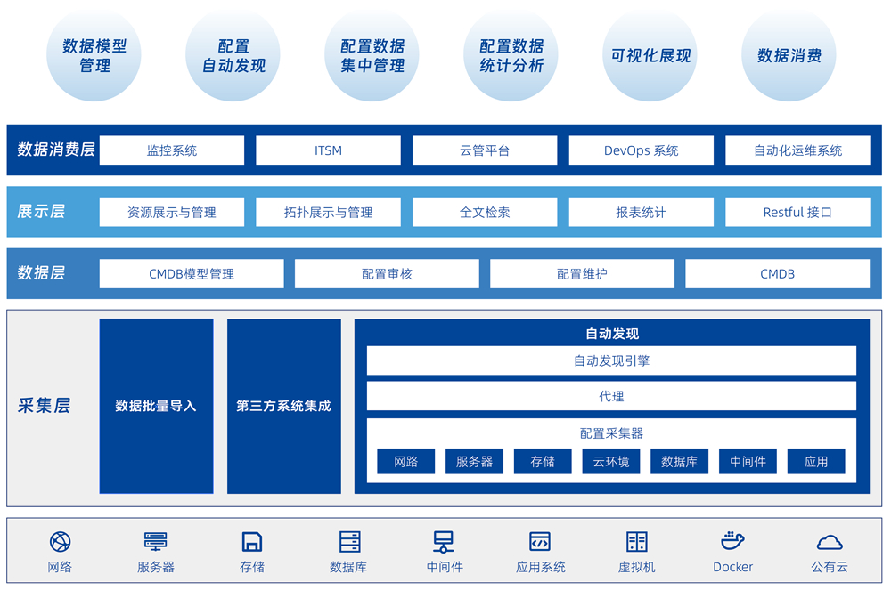 幫助用戶建立統(tǒng)一的運(yùn)維主數(shù)據(jù),通過各種自動(dòng)化手段實(shí)現(xiàn)以應(yīng)用為核心的全面資源管理以及運(yùn)維消費(fèi)場景共享。系統(tǒng)具備靈活的 CMDB 分層建模和配置信息維護(hù)機(jī)制,可以提供面向業(yè)務(wù)的 IT 架構(gòu)畫像,為各個(gè)運(yùn)維工具提供集中化的資源信息管理和協(xié)同,為 IT 運(yùn)維和 DevOps 體系下的各種運(yùn)維場景提供數(shù)據(jù)消費(fèi)服務(wù)。