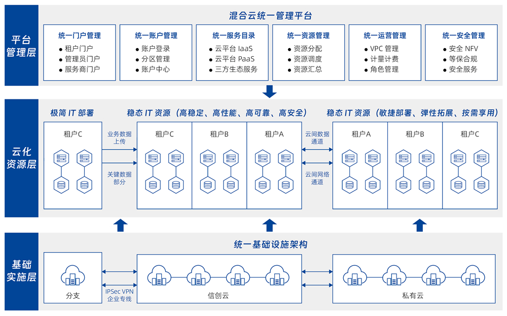 面向已部署多云、信創(chuàng)基礎(chǔ)設(shè)施的行業(yè)用戶,提供自助化、自動(dòng)化的云服務(wù)快速交付服務(wù)。管理企業(yè)內(nèi)部多個(gè)數(shù)據(jù)中心的物理、虛擬資源,以及容器、私有云、公有云資源,并對(duì)以上資源進(jìn)行混合編排,提供基礎(chǔ)軟件和應(yīng)用軟件的自動(dòng)化部署服務(wù),以及云資源的全生命周期管理。