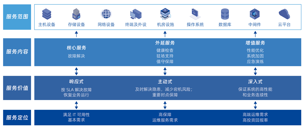 硬件維保(MA)服務(wù):提供主機(jī)、存儲(chǔ)、網(wǎng)絡(luò)、終端及外設(shè)、機(jī)房設(shè)施等硬件設(shè)備故障解決、健康檢查、駐場(chǎng)支持、值守保障、系統(tǒng)升級(jí)加固、應(yīng)急演練等服務(wù)。軟件維保(MA)服務(wù):提供操作系統(tǒng)、數(shù)據(jù)庫(kù)、中間件、存儲(chǔ)軟件等軟件產(chǎn)品故障解決、健康檢查、性能優(yōu)化、系統(tǒng)升級(jí)等服務(wù)。