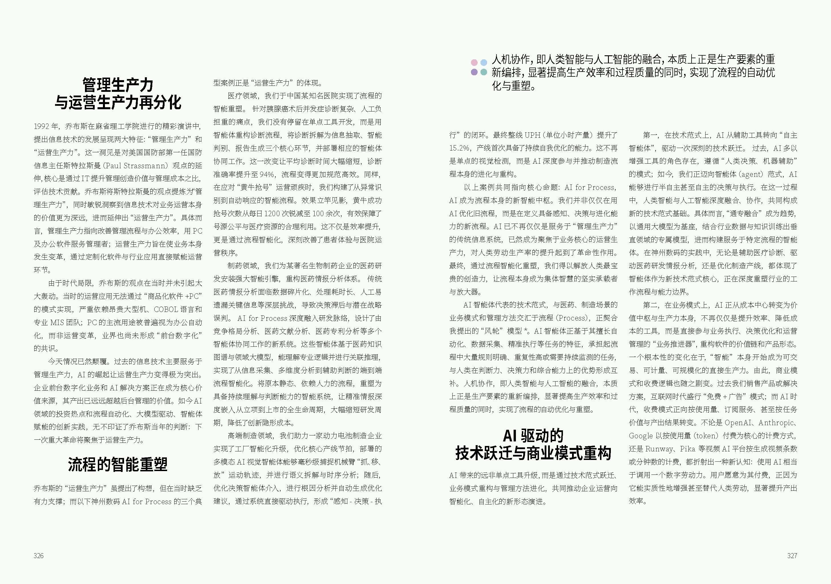 以上案例共同指向核心命題:AI for Process,AI成為流程本身的新智能中樞。我們并非僅僅在用AI優(yōu)化舊流程,而是在定義具備感知、決策與進(jìn)化能力的新流程。AI已不再僅僅是服務(wù)于“管理生產(chǎn)力”的傳統(tǒng)信息系統(tǒng),已然成為聚焦于業(yè)務(wù)核心的運(yùn)營生產(chǎn)力,對(duì)人類勞動(dòng)生產(chǎn)率的提升起到了革命性作用。最終,通過流程智能化重塑,我們得以解放人類最寶貴的創(chuàng)造力,讓流程本身成為集體智慧的堅(jiān)實(shí)承載者與放大器。